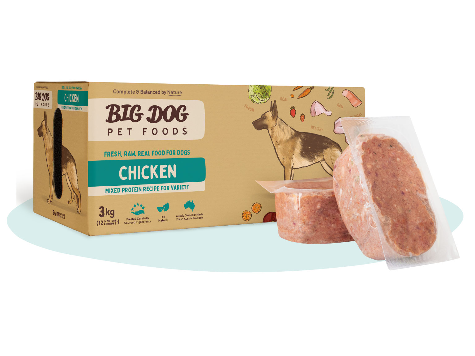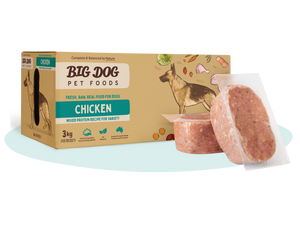 If your dog loves chicken over all other protein sources, then this flavour is what your dog needs! Our Chicken recipe uses only the highest quality, human-grade Australian chicken. Blended with the delicious and nutritious vitamin and mineral-rich offal from beef and lamb as well as whole salmon and sardines to ensure a good boost of Omega-3 essential fatty acids to your dog’s diet. Add to this nutrient-dense seasonal fruits and vegetables, as well as Big Dog’s special extra ingredients, including ginger, garlic, flaxseed, whole eggs, kelp, wheatgrass, probiotics and prebiotics and your dog’s health and happiness will be the envy of the neighbourhood!