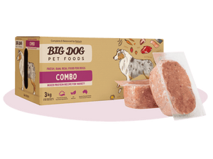 With more tasty forms of protein than your dog could dream of, our Combo recipe is a delicious combination of only the highest quality, human-grade Australian beef, lamb, chicken, pork, salmon and sardines. This recipe includes the goodness of whole fish, muscle meat, vitamin and mineral-rich offal and nutrient-dense seasonal fruits and vegetables. With the addition of Big Dog’s special extra ingredients, including ginger, garlic, flaxseed, whole eggs, kelp, wheatgrass, probiotics and prebiotics, your dog will be happy, healthy and satisfied! *Available in 3kg pack with 12 x 250g individual patties. For small dogs and puppies, available in a 1.5kg pack with 12 x 1.25 individual patties (see our small dog diet).