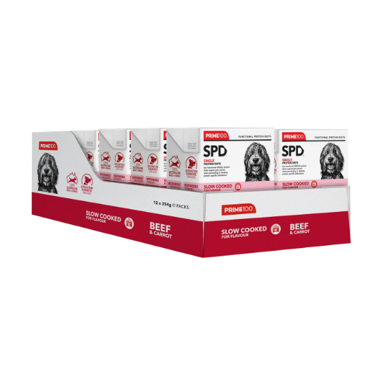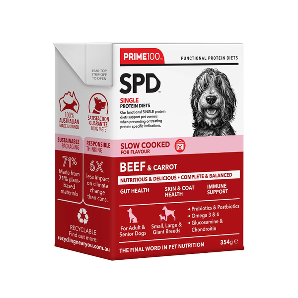 Prime100 SPD™ Slow Cooked Beef & Carrot is a single protein diet specifically designed for adult and senior dogs. Complete and balanced for dogs of all breeds, including giant breeds. No added artificial colours or flavours. Australian Beef provides a rich source of protein to support muscle growth and repair, while carrot adds essential vitamins and minerals to promote overall health and wellbeing.