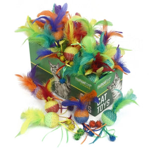 Mesh Ball cat toys are a glittery combination of mesh, feathers and ribbons that will attract cats and encourage play. They are lightweight making them easy to toss and bat. Cats will love the texture and natural feathers.