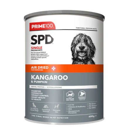 A vet approved, single-protein diet for dogs with low to acute food sensitivities. Designed by science with functional ingredients to form a complete and balanced air-dried diet. The 600g tin is convenient and perfect for storage without refrigeration. Wild Kangaroo from central Australia is an advanced novel hypoallergenic protein, highly suitable for elimination diets, weight management and ongoing assistance for dogs with protein responsive indications. Whole Australian pumpkin with added prebiotics and probiotics provides functional gastro-intestinal support and encourages healthy microbiome in the gut. Recommended for adult and senior dogs. Air Dried to Perfection.